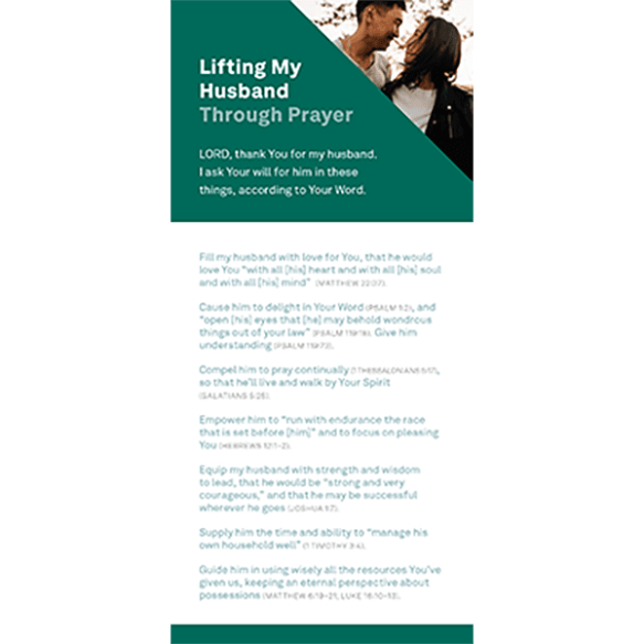 Prayer is powerful—because God, and our relationship with Him, is powerful. This easy-to-use prayer card equips you to bring your husband to the God who sees, through prayers full of God’s own words from Scripture: prayers of character, purpose, and hope.