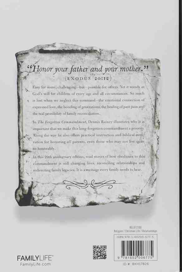 In “The Forgotten Commandment”, Dennis Rainey illustrates why it is important that we make this long-forgotten commandment a priority. Along the way he also offers practical instruction and biblical motivation for honoring all parents, even those who may not live quite so honorably.