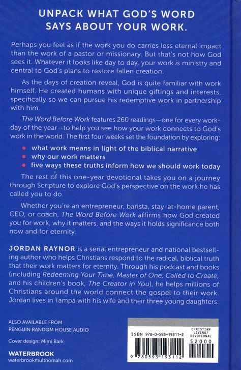 Whether you are an entrepreneur, barista, stay-at-home parent, CEO, or coach, “The Word Before Work” affirms God’s purpose in creating you for work, emphasizes its significance, and reveals its eternal implications.